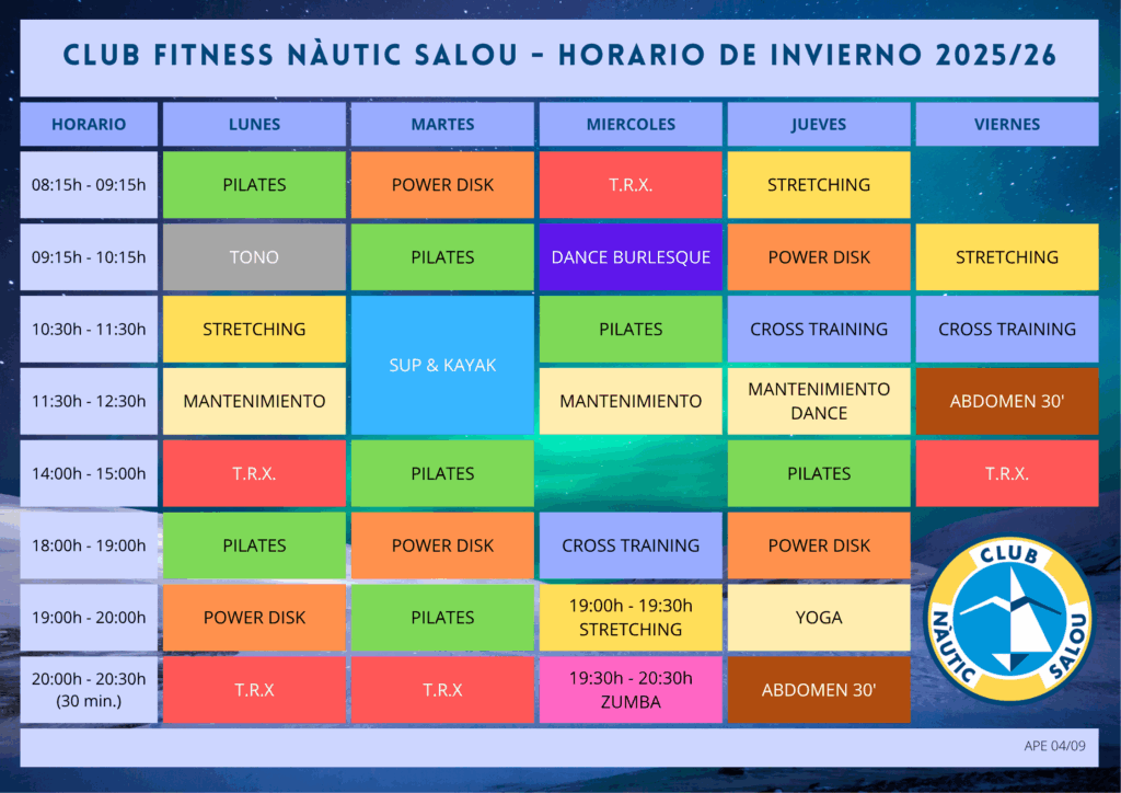 HORARIO DE INVIERNO DE LAS CLASES DIRIGIDAS DEL CLUB FITNESS NÀUTIC SALOU